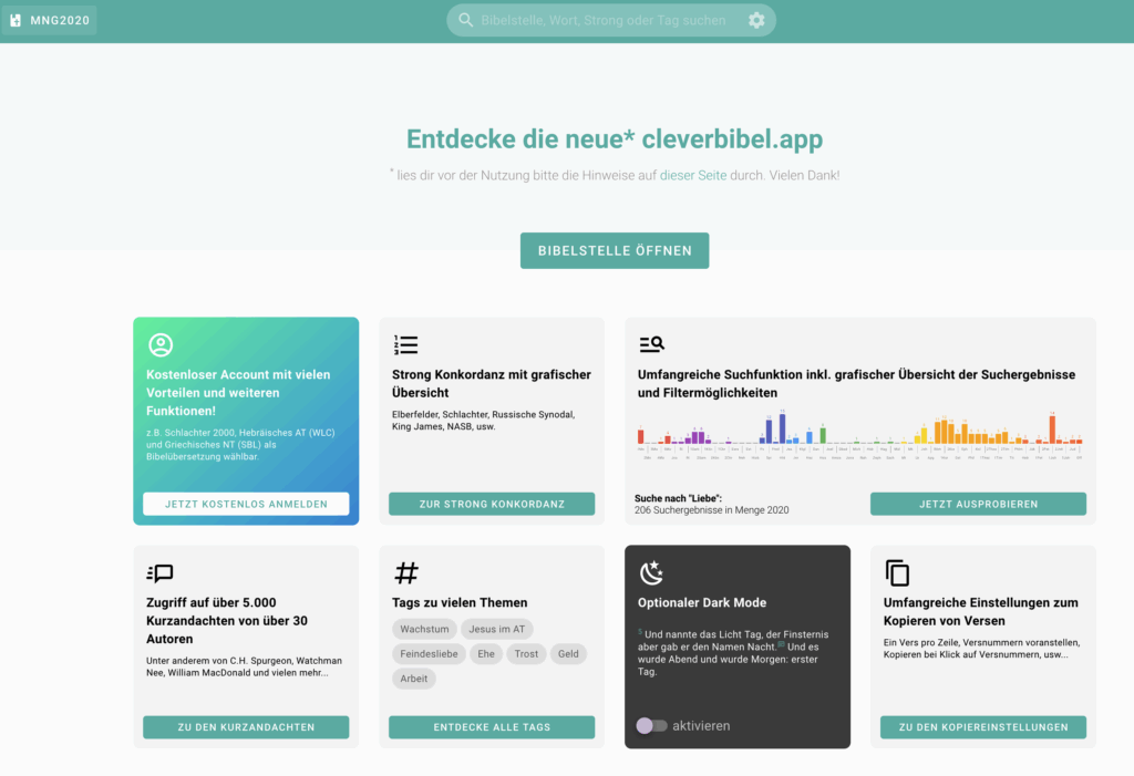 Diese Plattform erspart das aufwendige Suchen nach guten Kommentaren zu jedem beliebigen Bibeltext. Man gibt die jeweilige Bibelstelle oder das gewünschte Suchwort ein, und es erfolgt eine blitzschnelle Indexsuche in christlichen Webseiten, Zeitschriften und Büchern. Alle gefundenen Artikel werden dann so angezeigt, dass man auf einen Blick die Wichtigkeit erkennt und mit einem Klick ans Ziel kommt. Eine hilfreiche Webseite!
