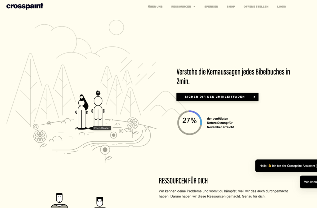 Die Mission von Crosspaint ist es, eine Leidenschaft in Menschen für Jesus zu wecken. Wir glauben, dass nur die Bibel und der Heilige Geist das tun können, deswegen erklären wir die Bibel in einfacher Sprache und verständlichen Kurzvideos. Und zwischendurch trinken wir die eine oder andere Tasse Kaffee.